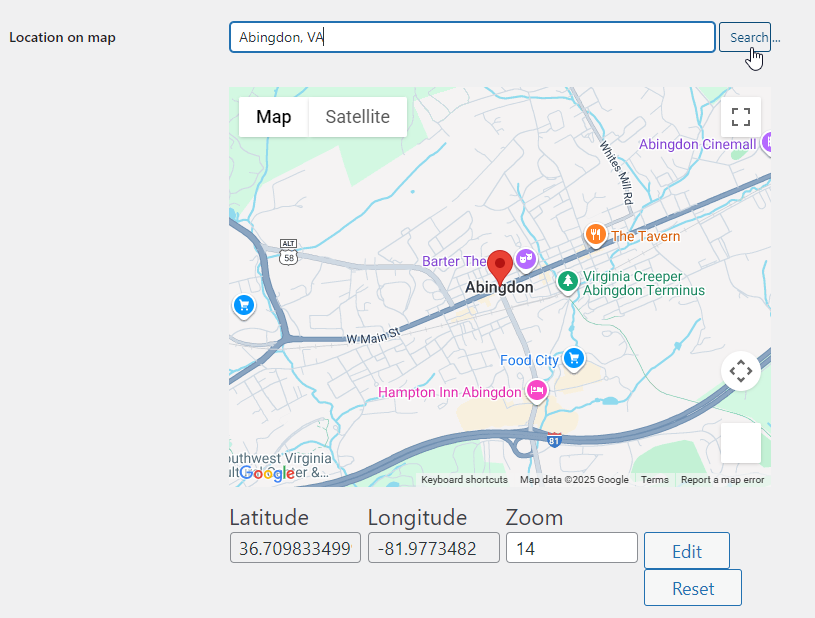 - Enter the location to show on the map (e.g. Abingdon, VA) and click Search to set the center point.