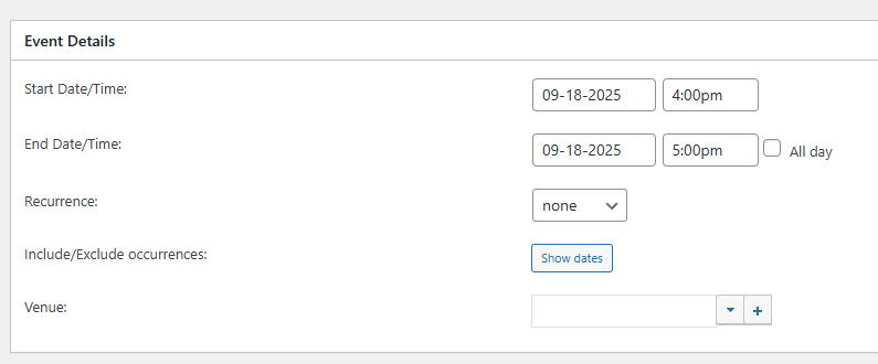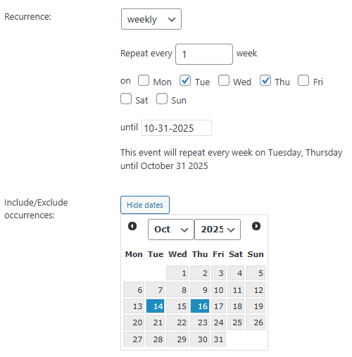 When using recurrences, it is important to note that the event as it is specified will be repeated. So, if the start & end span multiple days, then each repeat will also span multiple days. Usually this won’t be an issue, but it’s important to watch out for when doing daily or day of week based events.