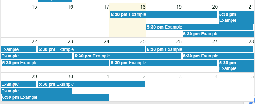An example of repeating an event daily with a start & end spanning multiple days is listed below, notice that the calendar looks a bit odd with so many events packed in, this is because the multi-day event is being duplicated daily: